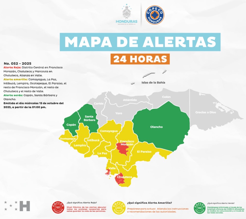 Asimismo, se mantiene La alerta verde para los departamentos de Copán, Santa Bárbara y Olancho.