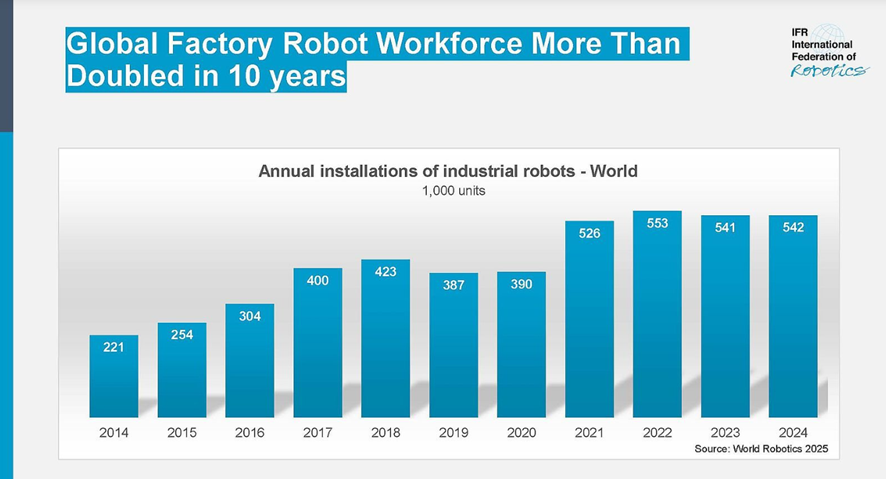 La Federación Internacional de Robótica (IFR) presentó su informe World Robotics 2025, en el que se confirma que en 2024 se instalaron 542.000 robots industriales, más del doble que hace una década. Este es el segundo mayor registro histórico, apenas un 2 % por debajo del máximo alcanzado en 2022.