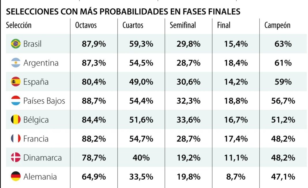 Brasil encabeza las predicciones con un 63%, seguido de Argentina con 61%, España 59%, Países Bajos 56,7% y Belgica con 51,2%.
