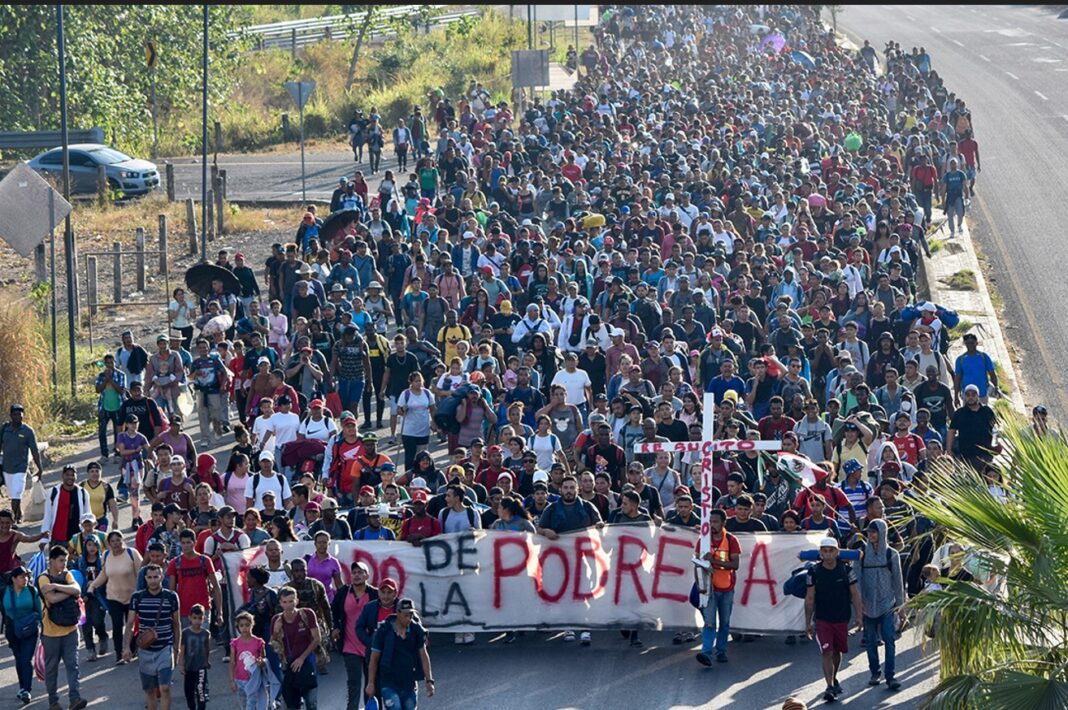 Este día, migrantes y solicitantes de asilo, muchos de ellos con niños pequeños, caminaron por la carretera cerca de la ciudad Villa Comaltitlán, en el sur de México. Algunos sostenían una pancarta en la que se leía «Éxodo de la pobreza».
