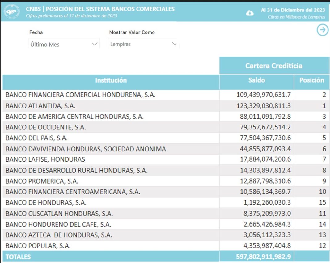 En cuanto a los bancos, la cartera de crédito privada terminó el año con dos bancos superan los 100.000 millones de lempiras en préstamos vigentes.