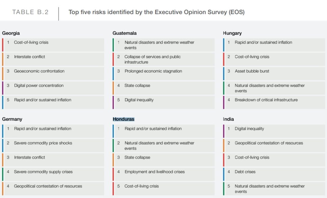 Los cinco mayores riesgo de Honduras son: «Además de la «Rápida y sostenida inflación, Catástrofes naturales y fenómenos meteorológicos, Existe el riesgo de Colapso del Estado, Crisis de empleo y medios de subsistencia y crisis por Coste de vida».
