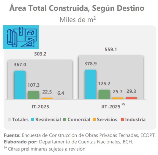 Le siguen las áreas comerciales al sumar 125.2 mil m², reflejando alza de 16.7 % (17.9 mil m²). Por su parte, el área construida de las obras destinadas a la prestación de servicios totalizó 25.7 mil m², lo que se traduce en crecimiento de 14.2% (3.2 mil m² adicionales) y para el sector industrial, el área edificada experimentó un alza del 357.8%, al pasar de 6.4 mil m² en el primer trimestre de 2025 a 29.3 mil m² en el segundo trimestre del mismo año.