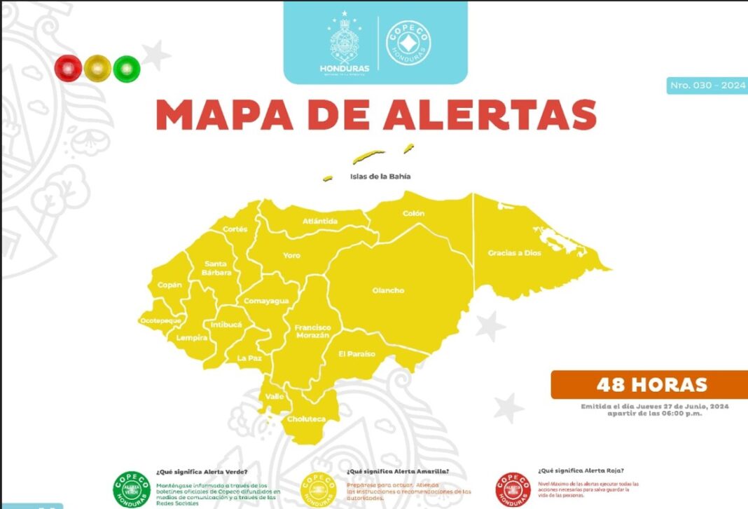 La Secretaría de Gestión de Riesgos y Contingencias Nacionales (Copeco) declaró Alerta Amarilla en todo el territorio hondureño por un período de 48 horas. El motivo de la declaración de alerta es por el ingreso de un sistema de baja presión que dejaría fuertes lluvias en el país.