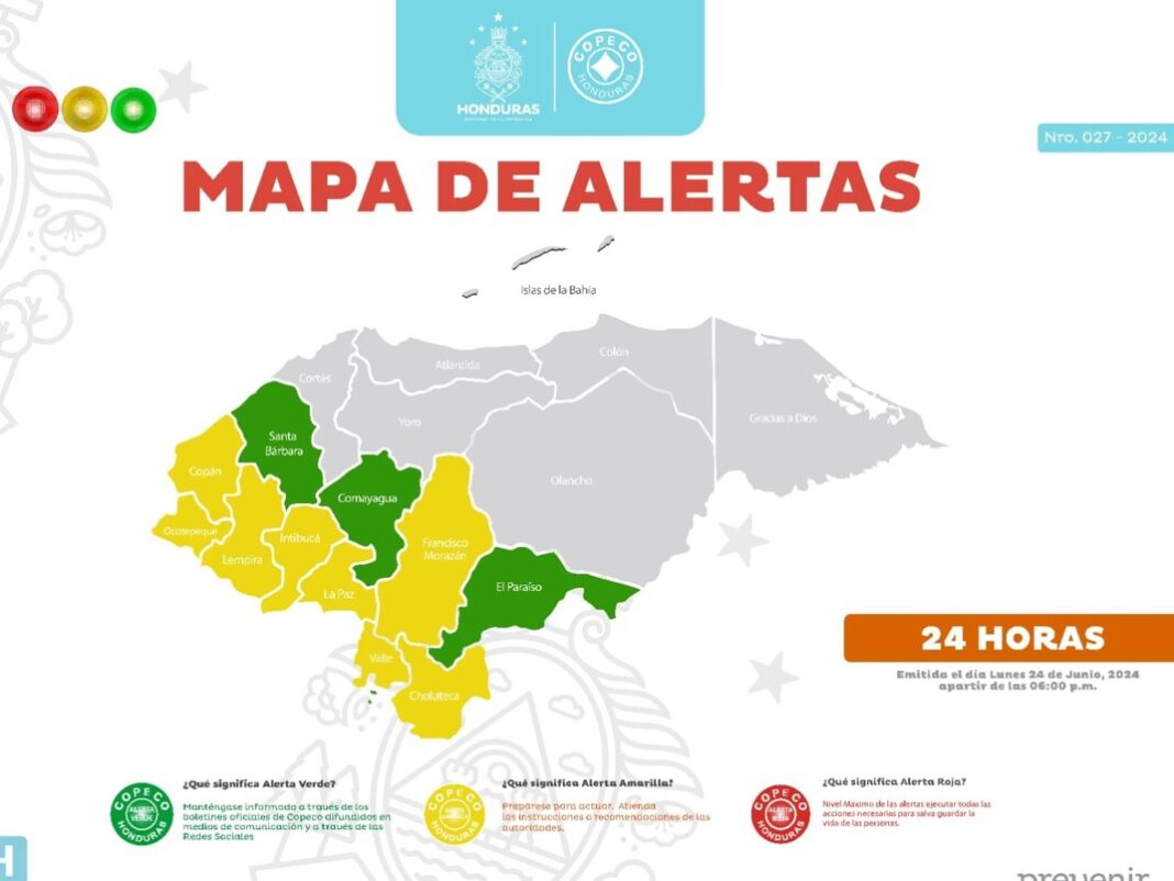 Ocotepeque, Lempira, La Paz, Intibucá y Valle, que estaban en alerta roja (evacuación), se unen a Copán, Francisco Morazán y Choluteca, en alrta amarilla (preparados para evacuar), mientas en alerta verde continúan los departamentos de Santa Bárbara, Comayagua y El Paraíso. El resto del país se mantiene sin alertas.