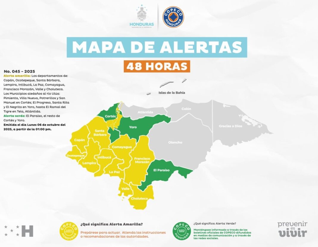 Asimismo, se emite Alerta Verde para los departamentos de El Paralso, el resto de Cortés y de Yoro, por un período de 48 horas a partir de la 1:00 p.m. del lunes 6 de octubre de 2025.