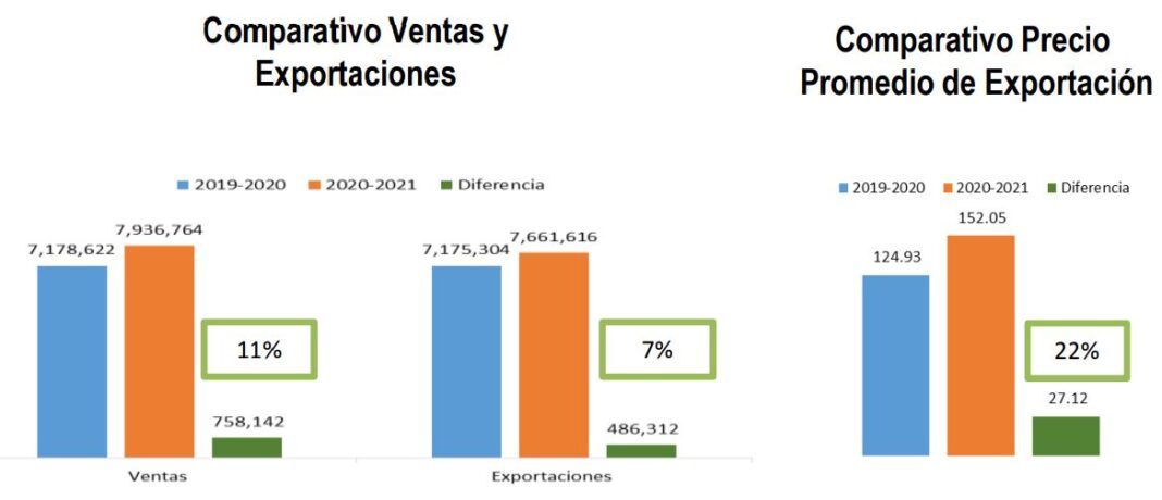 Los contratos de venta suman un total de 7.93 millones de sacos de 46 kg, mostrando un incremento del 11% comparado a los 7.17 Millones de sacos registrados a esta misma fecha en 2019-2020.