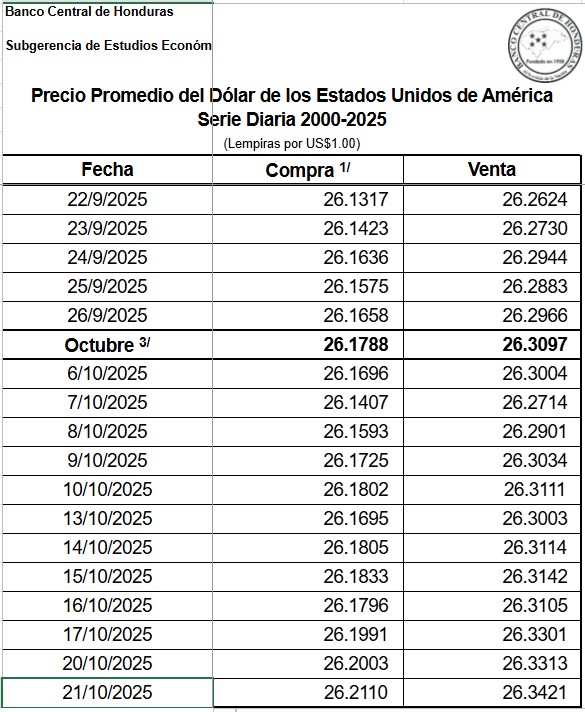 Y es que el Tipo de Cambio de Referencia (TCR) de la Subasta de Divisas del Banco Central de Honduras, para hoy 21 de octubre, es de 26.2110 lempiras. El valor de venta subió a 26.3421 lempiras.