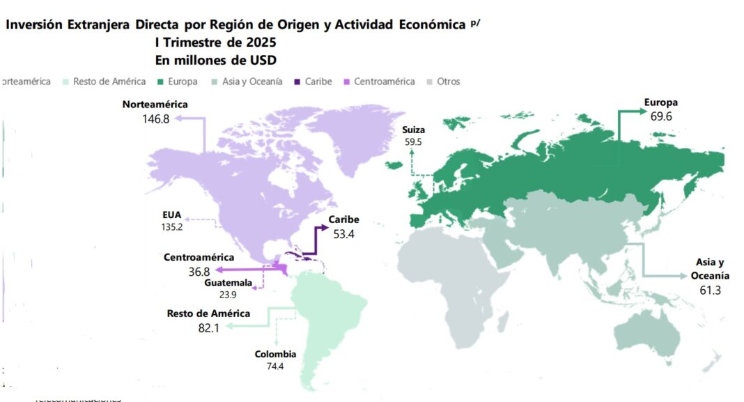 Durante el primer trimestre del año, las empresas con capital extranjero provenientes de Norteamérica, específicamente de Estados Unidos, lideraron la entrada neta de capitales con 146.8 millones de dólares, de los 428 millones de IED registrada.