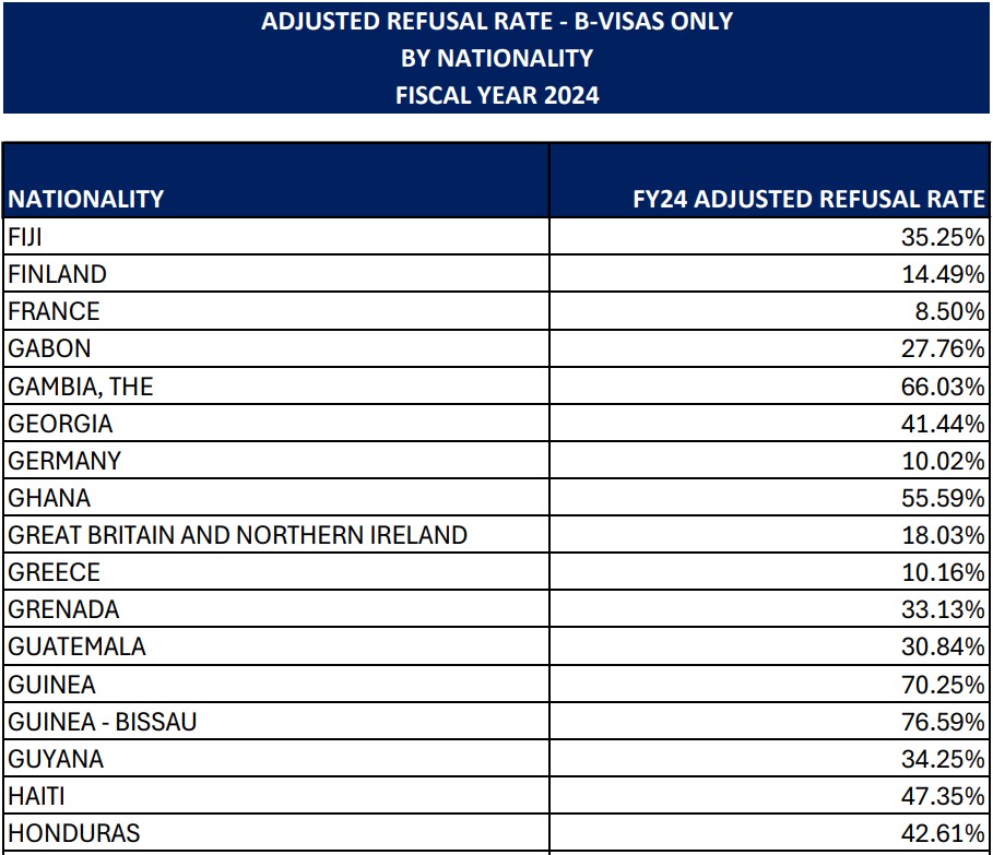 Cabe destacar que las tasas de rechazo publicadas por el DOS tratan sobre las visas de no inmigrante tipo B (B-1 para negocios y B-2 para turismo) correspondientes al año fiscal 2024.