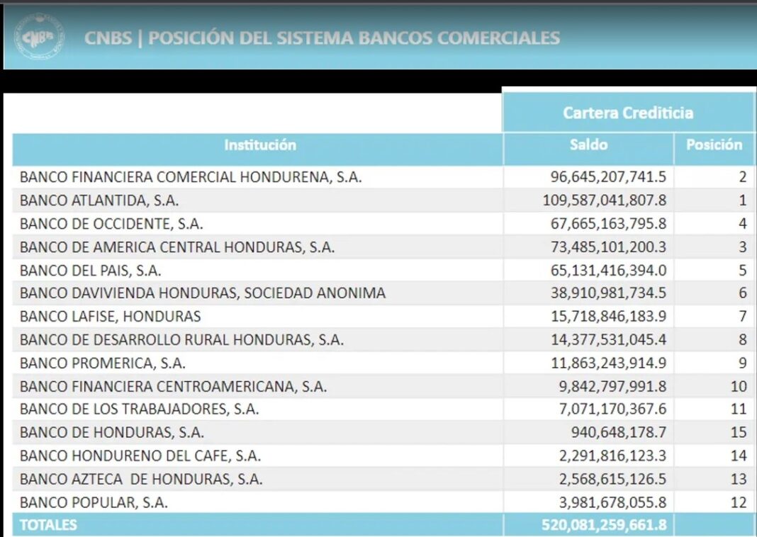 De los más de 520 mil millones de lempiras de la cartera crediticia, dos bancos concentran más de 200 mil millones de lempiras. Banco Atlántida suma 109.587 millones y Ficohsa 96.645 millones de lempiras.