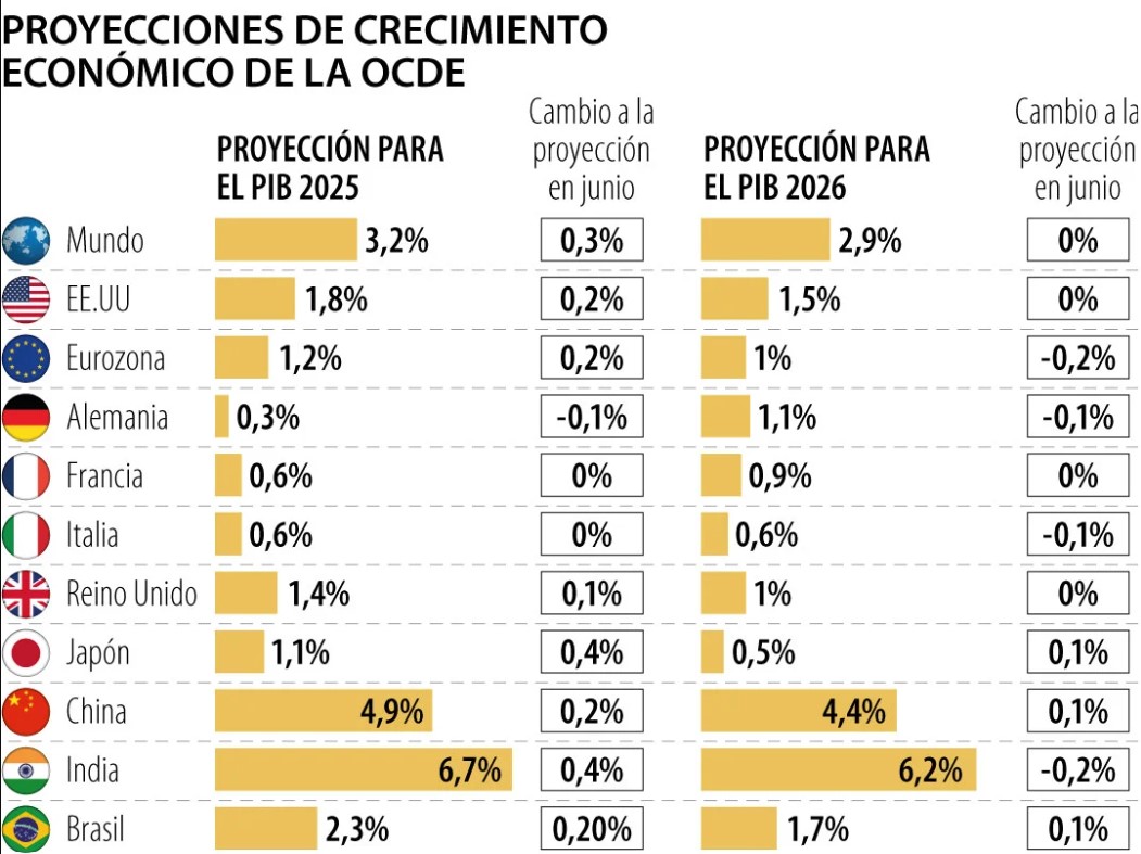 En nuevas proyecciones publicadas ayer martes, la organización con sede en París elevó sus pronósticos de crecimiento mundial para 2025 y el de la mayoría de las economías individuales, citando el efecto de la anticipación de compras frente a la inminente subida de aranceles. EEUU también mostró una fuerte inversión en inteligencia artificial, mientras que China se beneficia de apoyo fiscal.