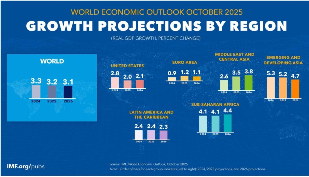 El FMI aumenta su previsión de crecimiento global para 2025 a un 3,2%, frente al 3% de julio anterior, mientras mantiene su predicción para 2026 sin cambios, en 3,1%, de acuerdo a sus Perspectivas de la Economía Mundial (WEO, por sus siglas en inglés).