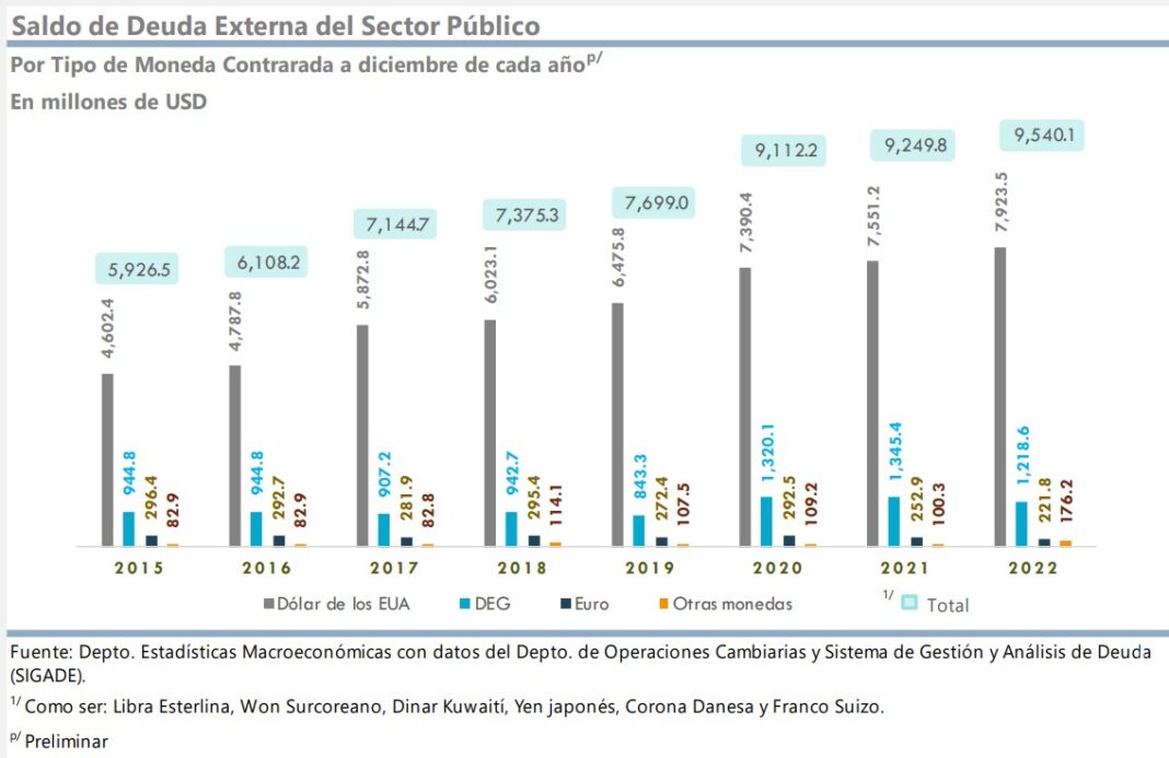 Al cierre de 2022, la deuda externa del sector público se ubicó en 9.540.1 millones de dólares, monto superior en 290.3 millones (3,1%) en comparación al reportado a diciembre de 2021 ($9.249.8 millones).