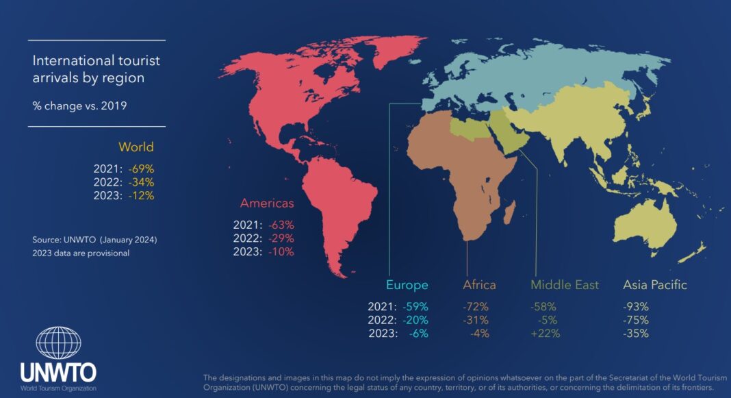 Según el primer número del Barómetro OMT del Turismo Mundial del año, en 2023 el turismo internacional alcanzó el 88% de los niveles registrados antes de la pandemia (2019), con un número estimado de 1.300 millones de llegadas internacionales.
