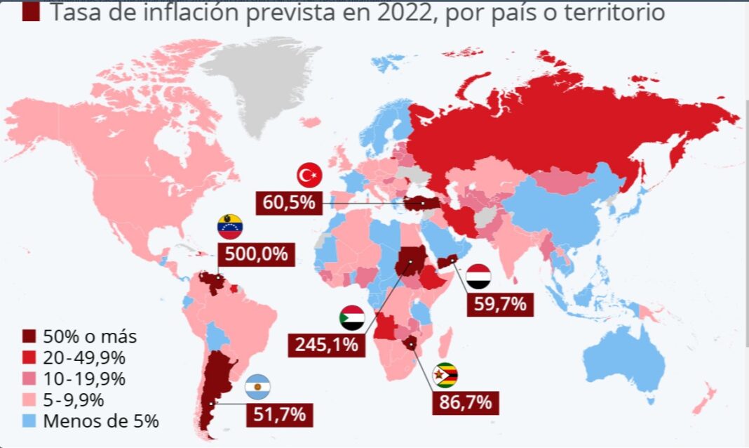 Como muestra este gráfico de Statista, ningún país del mundo tendrá más inflación que Venezuela este año, donde podría alcanzar un 500%. Sudán sería la segunda economía más afectada, con una tasa de más de 245%, seguida por Zimbabwe (86,7%), Turquía (60,5%), Yemen (59,7%) y Argentina (51,7%).