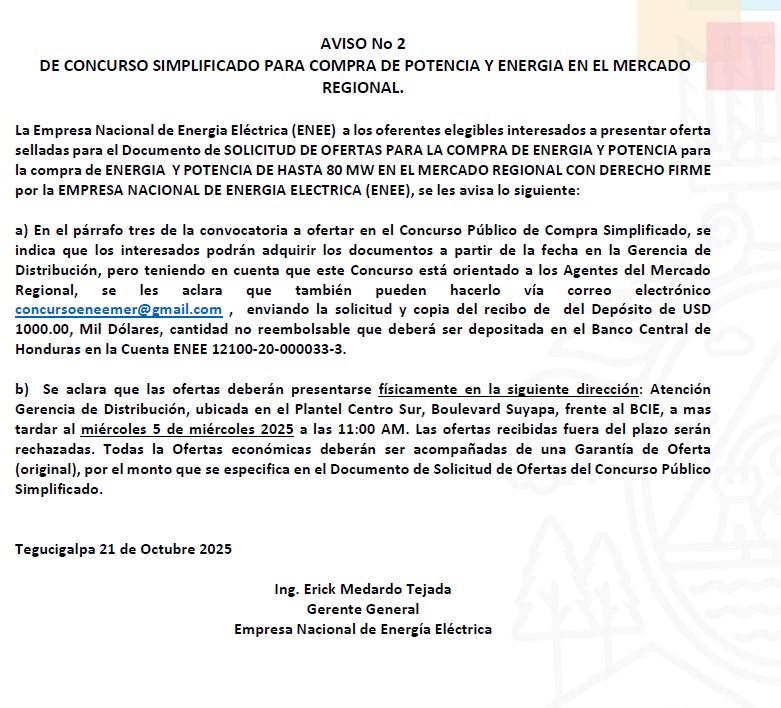 La Empresa Nacional de Energía Eléctrica (ENEE) dio a conocer las bases de la licitación pública en el mercado eléctrico regional, dirigida a las empresas oferentes interesadas en participar en el proceso «simplificado» para la «compra de energía y potencia de hasta 80 MW» (megavatios).