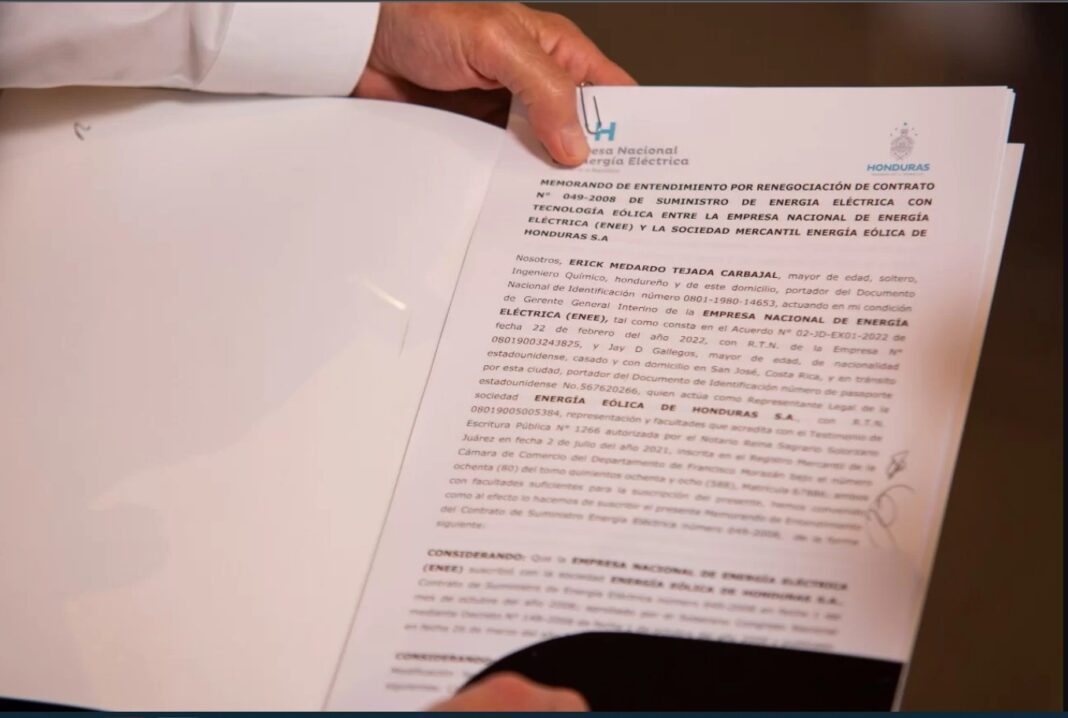 Por los momentos, el memorándum individual se firmó con las empresas: Enersa, Sersa, Fotersa, Tres Valles, Escatec, Empresa Eólica Honduras, Total Erén, Chumbagua, Comercial Laeisz y Energys.
