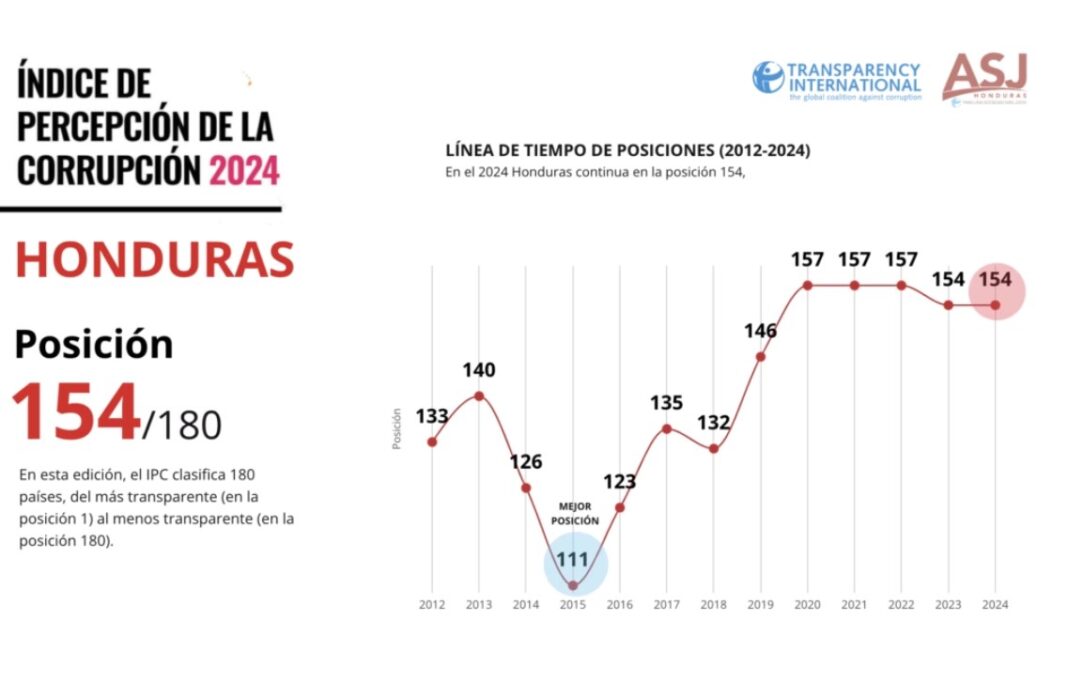 El IPC, que clasifica a 180 países y territorios, utiliza una escala de 0 a 100, donde cero indica altos niveles de corrupción y 100 representa transparencia. Desde 2012, Honduras ha fluctuado entre 23 y 31 puntos, pero en esta edición cayó a su mínimo histórico de 22 puntos, ubicándose en el puesto 154, igual que en 2023.