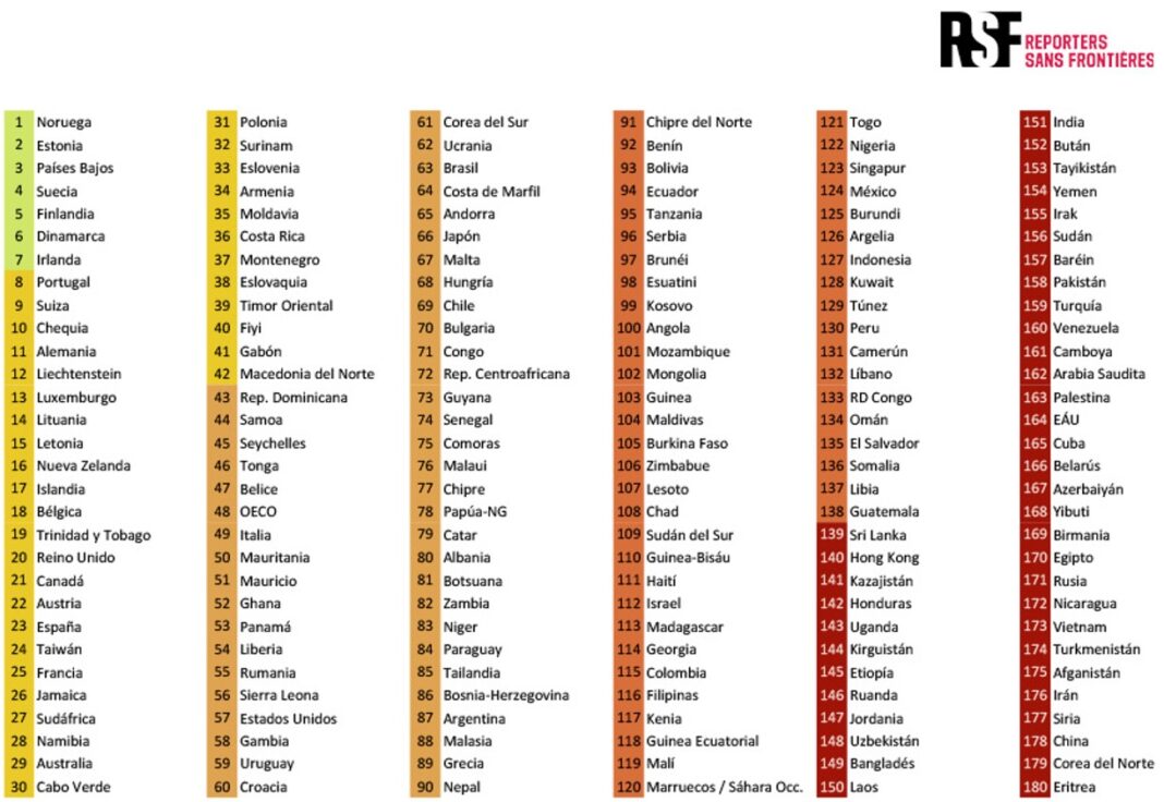 El ranking mundial lo lideró Noruega, que se mantuvo en el primer puesto. Reporteros sin Fronteras destacó el dinamismo del mercado de medios noruego, la solidez de las emisoras públicas y la independencia editorial.