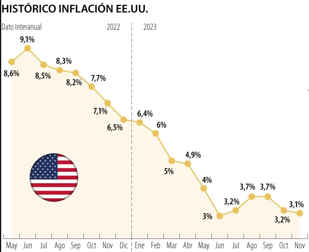 La tasa de inflación anual en Estados Unidos se desaceleró hasta 3,1% en noviembre de 2023, la lectura más baja en cinco meses, desde 3,2% de octubre y en línea con las previsiones del mercado. La meta es de 2% anual.