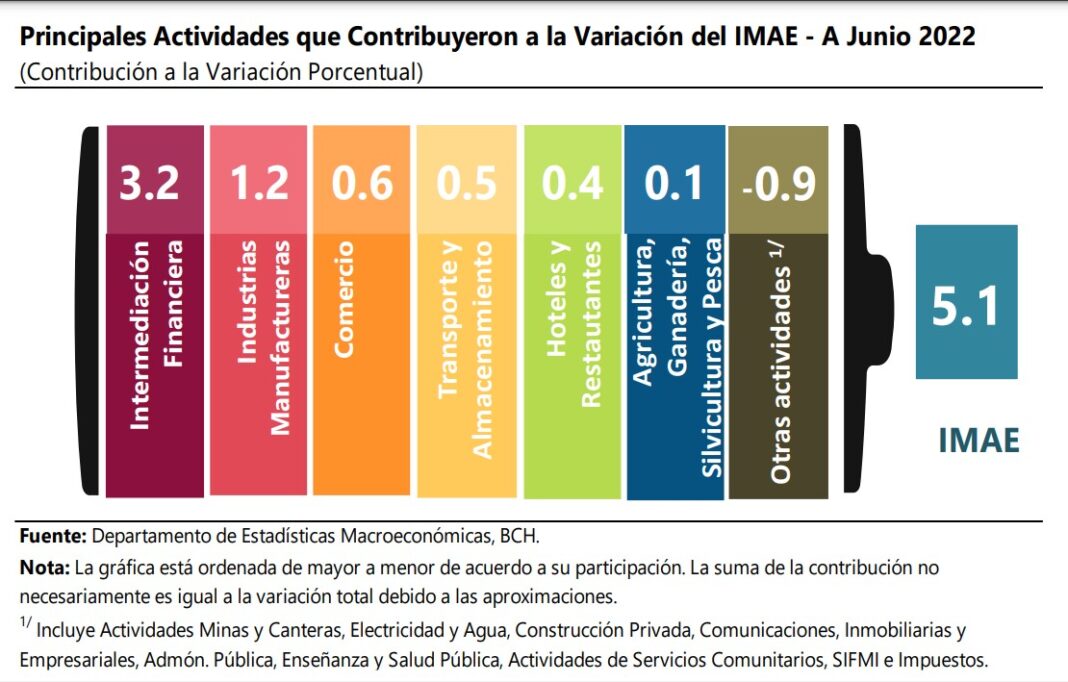 Sin embargo, el IMAE cayó 0,5% en relación a mayo y de manera interanual, se ubicó en 2,7%, derivado -en parte- del contexto económico mundial menos favorable, así como por el incremento de la inflación lo que afecta los ingresos y la demanda interna.