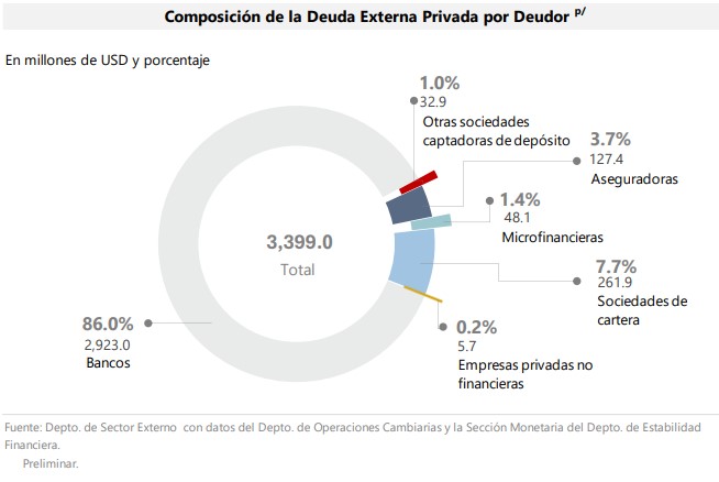 Por tipo de sociedad deudora, el 86% ($2,923 millones) de la deuda externa del sector privado corresponde a obligaciones de los Bancos Comerciales.