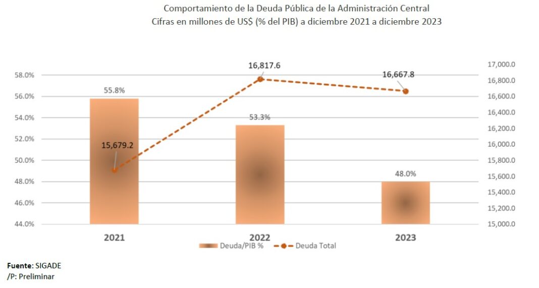 Al cierre del año 2023, el saldo de la Deuda Pública (externa e interna) de la Administración Central se sitúo en $16,667.8 millones de dólares, la relación deuda PIB se ubicó en 48%, menor 0,9% con respecto al año 2022 ($16,817.6), según informó la Secretaría de Finanzas.