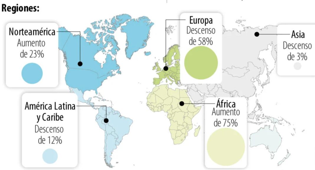 África experimentó un aumento récord del 75% en la IED, impulsado por un megaproyecto de infraestructura en Egipto. Sin contar este, los flujos crecieron un 12%, impulsados por reformas de inversión y una mayor facilitación en todo el continente.