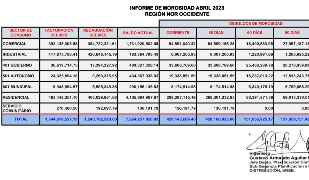 El sector Residencial sigue con el mayor nivel de mora con 8.500 millones de lempiras. Esto a pesar del cambio de contadores que promueve la actual Comisión Interventora de la ENEE. En la zona noroccidental está el mayor número de morosos y las cuentas pendientes sumaron 4.135 millones de lempiras al mes de abril.