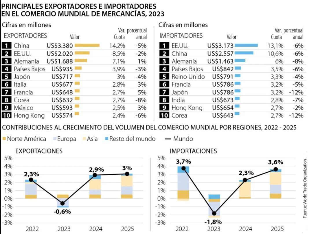 Un informe de la Organización Mundial del Comercio (OMC), destaca patrones clave de comercio y ofrece un panorama y proyecciones, entre las cuales está el crecimiento de 3% para las exportaciones y 3,6% para las importaciones en 2025.