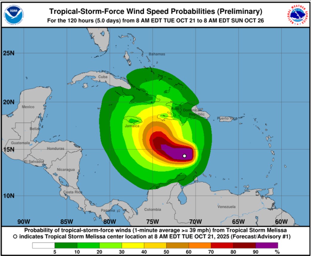 Melissa se encuentra actualmente unos 480 kilómetros al sur de Puerto Príncipe, con vientos máximos sostenidos de 85 kilómetros por hora y se espera que pueda convertirse en huracán durante el fin de semana.