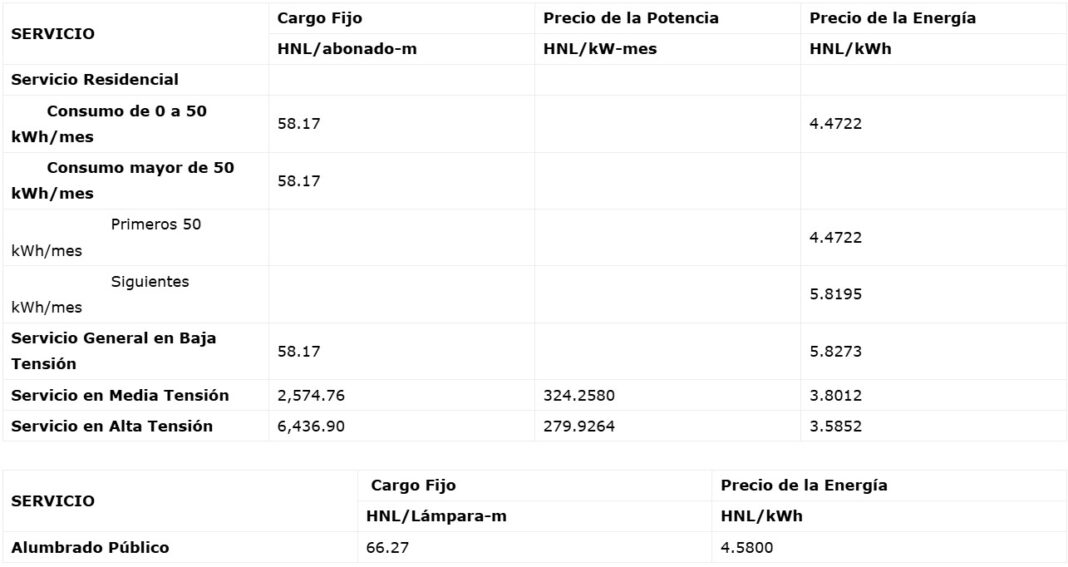 El precio del kwh por el consumo mayor a 50 kwh al mes será de 5.81 lempiras en el sector residencial, menor a los 6.40 lempiras del trimestre anterior. A pesar de la rebaja a la tarifa promedio, aumentó el cargo fijo mensual residencial y de alumbrado público.