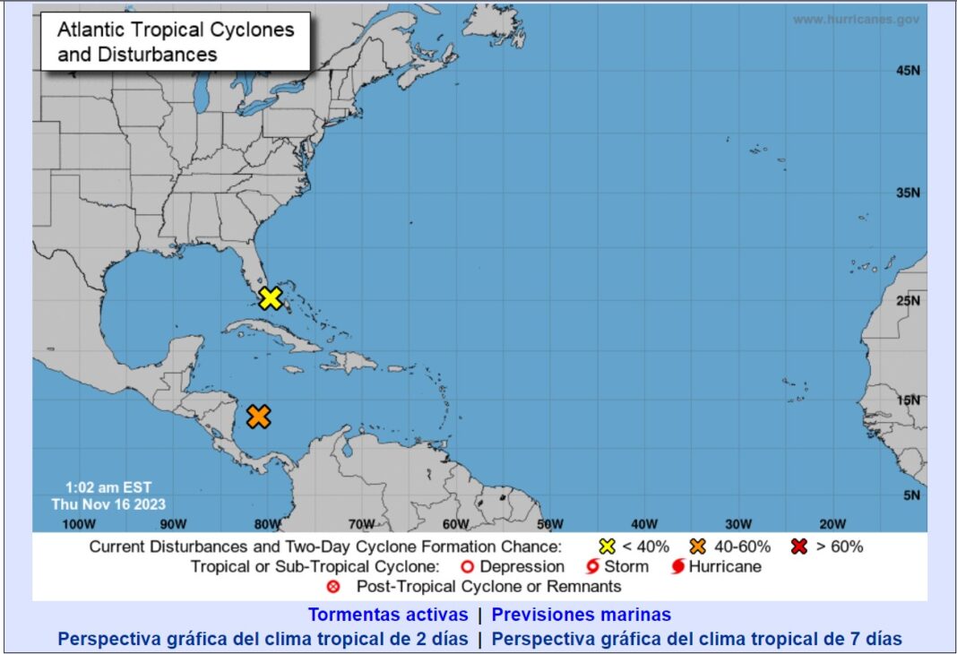 Según el CNH hay «Potencial de fuertes lluvias en el Mar Caribe». «Las condiciones parecen marginalmente propicias para el desarrollo de este sistema durante los próximos dos días, y una depresión tropical podría se formará este fin de semana a medida que el sistema se mueva hacia el noreste a través del parte occidental y central del Mar Caribe», señala.