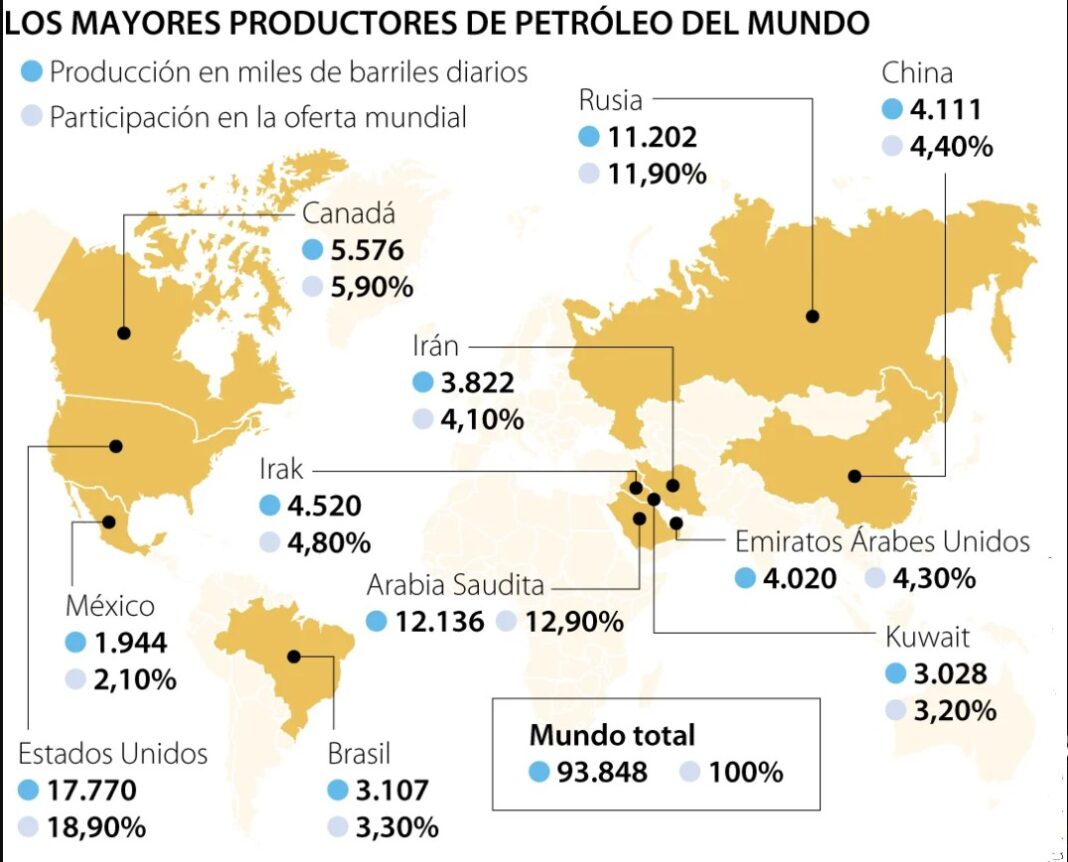 En el segundo puesto sigue Arabia Saudita, con 12 millones de barriles diarios, lo que representa aproximadamente 13% del suministro mundial. El top 3 lo cierra Rusia con 11 millones de barriles diarios producidos en 2022. El cuarto y el quinto puesto lo ocupan Canadá e Irak. De esta manera, los cinco mayores productores representan más de la mitad del suministro mundial de petróleo.
