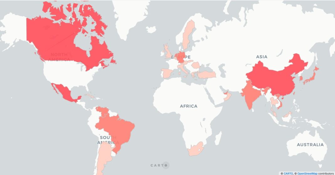 Hasta hoy, tres países son los más afectado: Canadá, México y China con aranceles del 25% en el sector automotriz y otros bienes. Les siguen en impacto Brasil, Venezuela, India, Vietnam, Japón, Alemania, Países Bajos, Emiratos Árabes Unidos,