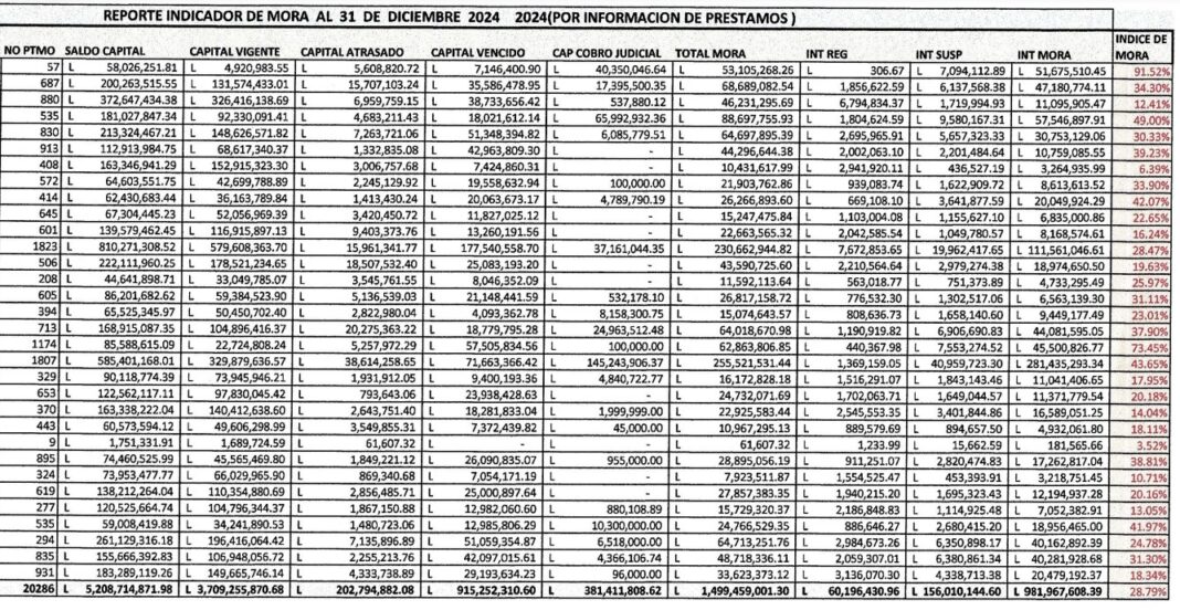 De los casi 1.500 millones de lempiras en mora, 381.4 millones se encuentran en cobro judicial,915 millones es capital vencido y 202.7 millones está «atrasado».