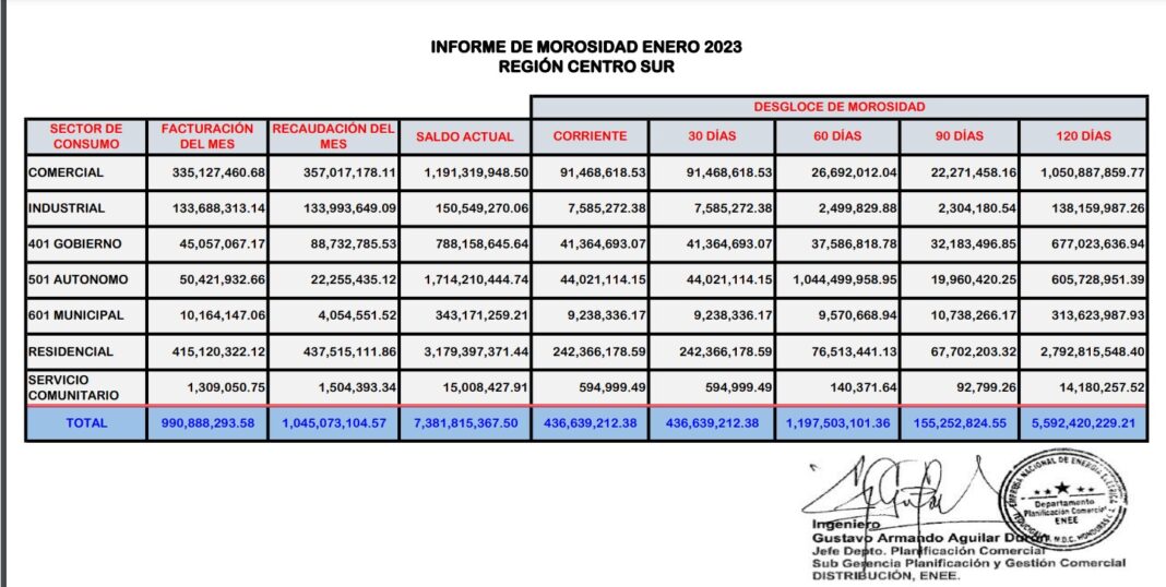 Según la Dirección de Planificación Comercial de la ENEE, a enero anterior, la mora sumó 16.176 millones de lempiras, apenas 0,66% menos que la acumulada al 31 de diciembre del año pasado cuando superaba los 16.284 millones de lempiras.