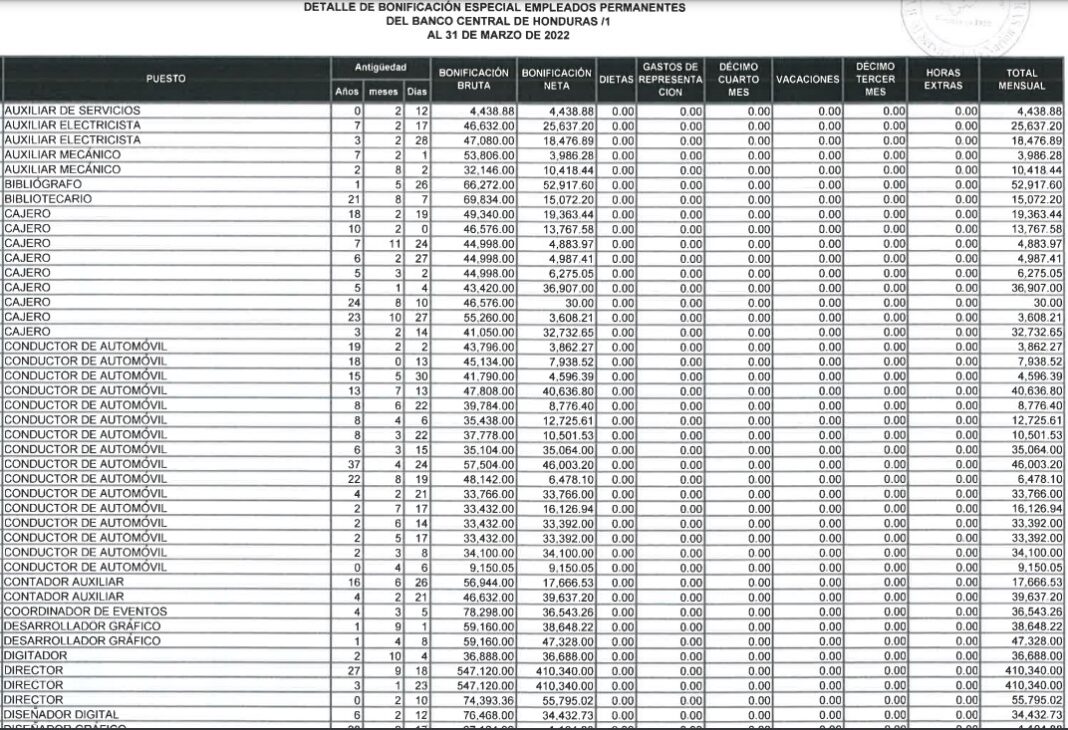 También un Gerente tuvo un bono bruto de 544.186 lempiras (408.139 lempiras netos), los cinco subgerentes entre 351.367 y 404.481 lempiras netos y un «Asesor» recibió bonificación bruta de 467.220 lempiras (350.415 lempiras netos). Mientras la Presidenta del BCH, tuvo un bono de «54.186 lempiras netos», un poco más del 30% de su sueldo de 135.000 lempiras.