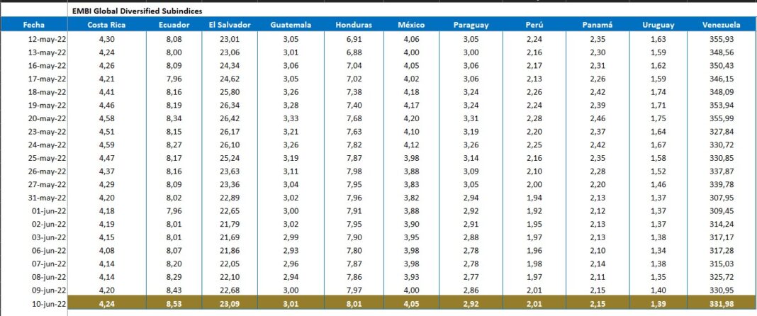En Latinoamérica, al 10 de junio, la peor situación es para Venezuela con un 331,98%, seguido por El Salvador (23,09%), afectado por el riesgo de pago de bonos y la caóida del precio del bitcoin, Argentina (20,43%), Ecuador (8,53%) y Honduras con 8,01% (subió al 8,30% este lunes 13 de junio).