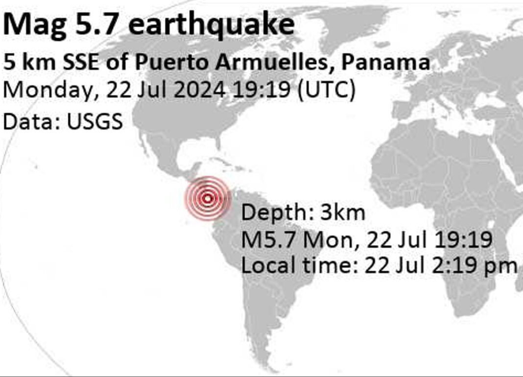 De acuerdo al Usgs (por sus siglas en inglés), el temblor ocurrió en las primeras horas de la tarde a unos 5 kilómetros al sureste de la localidad panameña de Puerto Armuelles, a una profundidad de 3 kilómetros.