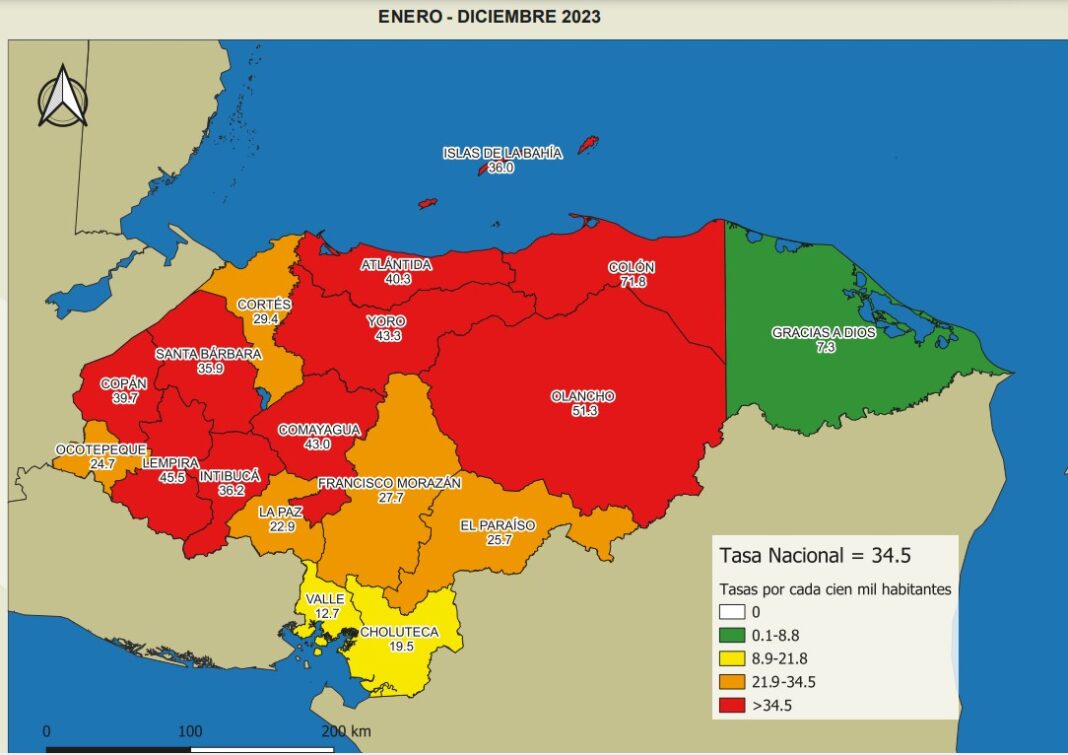 En 2023, 10 de los 18 departamentos del país alcanzaron tasas más altas que la nacional (34.5 pccmh): Colón (71.8), Olancho (51.3), Lempira (45.5), Yoro (43.3), Atlántida (40.3), Comayagua (43.0), Copán (39.7) Intibucá (36.2), Islas de la Bahía (36.0) y Santa Bárbara (35.9).