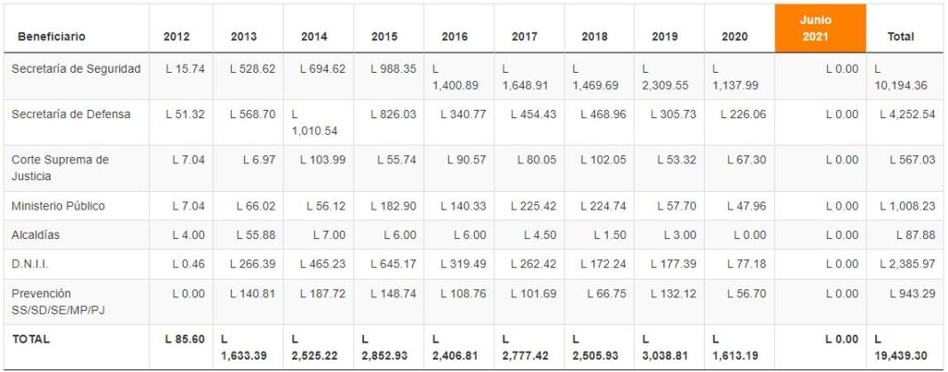 En nueve años, la Tasa de Seguridad o Tasón, registra erogaciones por «19.439 millones de lempiras» a 11 instituciones, seis de manera directa. Sin embargo, los resultados de combate a la criminalidad no muestran niveles de reducción de acuerdo a la inversión realizada.