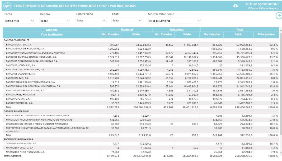 Son depósitos de ahorro en 15 bancos, 6 financieras y 4 Privadas de Desarrollo Financiero (OPDF) de primer nivel. La banca concentra la mayor parte de los depósitos de ahorro y el lempira es la moneda dominante con el 71% del total.