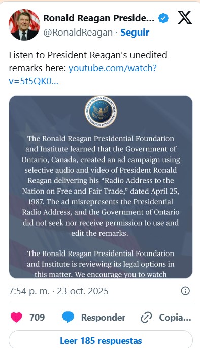 El anuncio, publicado por el gobierno de la provincia canadiense de Ontario, utilizó “selectivamente audio y video” de un discurso radial que Reagan pronunció a la nación en abril de 1987 sobre política comercial, informó la Fundación Ronald Reagan en la red X.