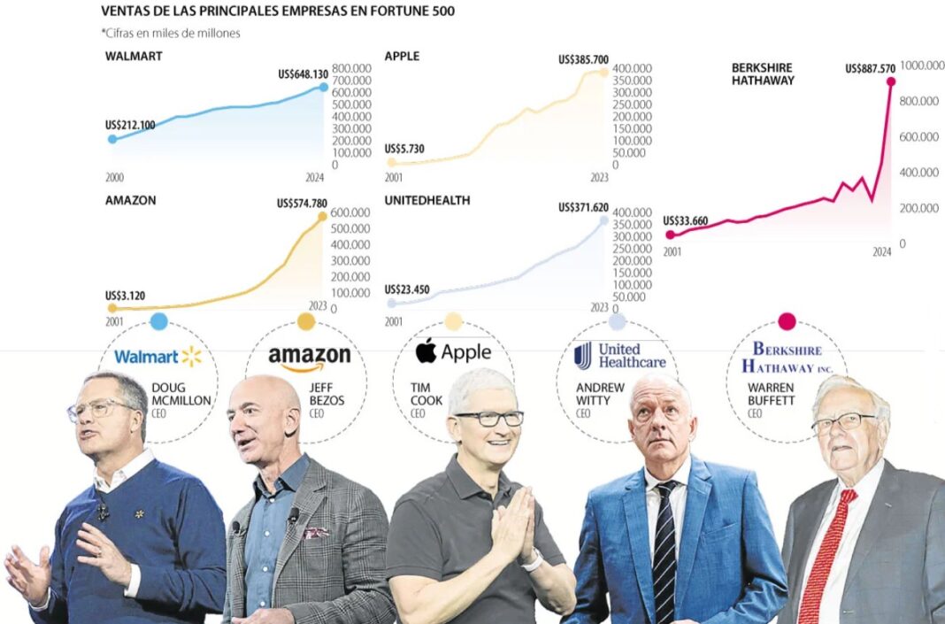 El top cinco presentó una variación frente a 2023. Además de sobresalir las fotos de Doug McMillon, CEO de Walmart, y el multimillonario Jeff Bezos de Amazon, Tim Cook de Apple subió al puesto tres; mientras que Andrew Witty, CEO de UnitedHealth Group es cuarto, y quinto, el veterano Warren Buffett, cabeza de Berkshire Hathaway.